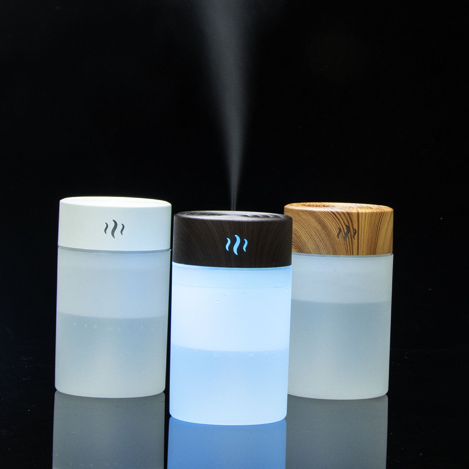 This elegant diffuser features a natural wood-grain design and soft LED color glow for a soothing atmosphere.